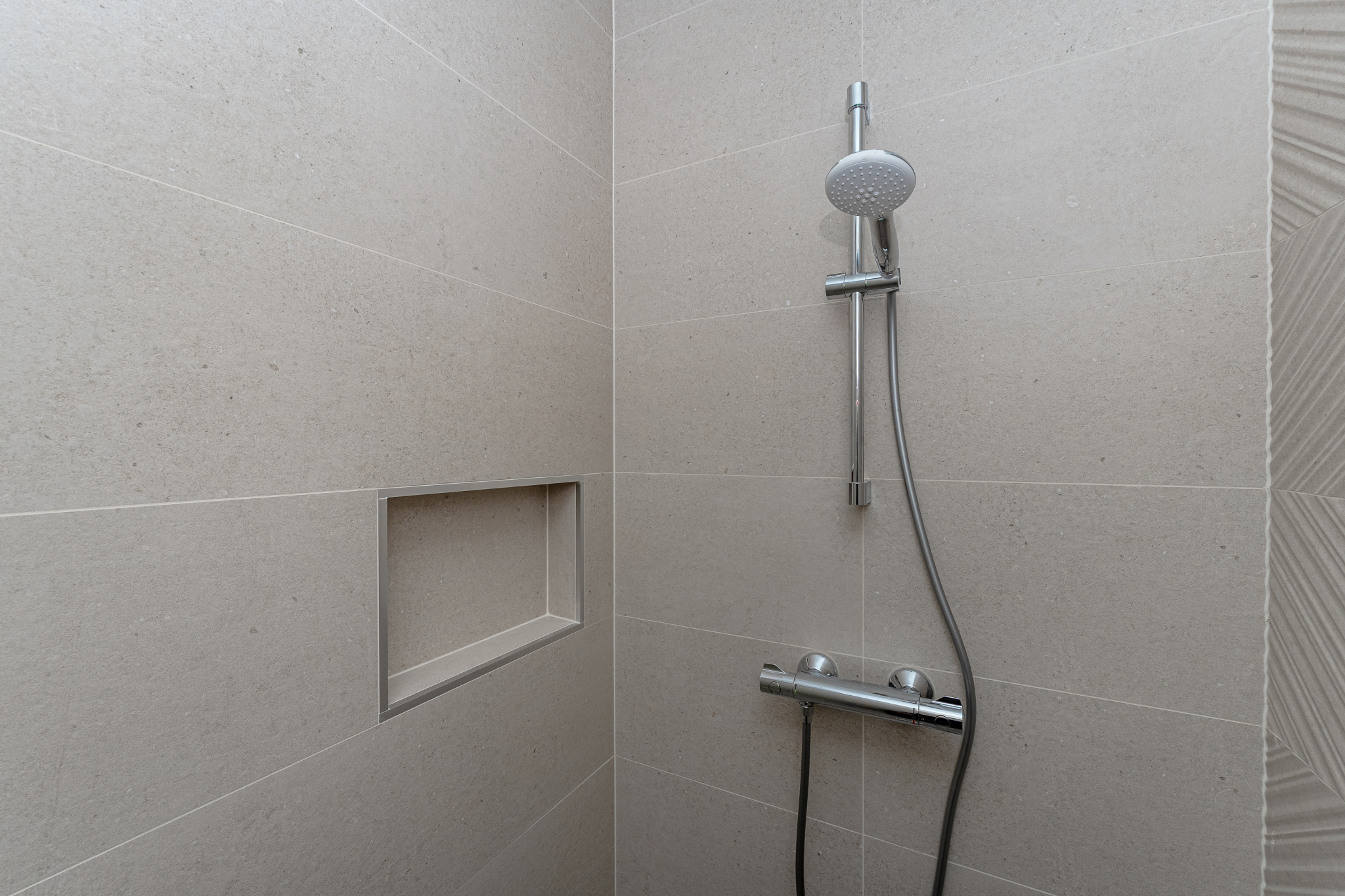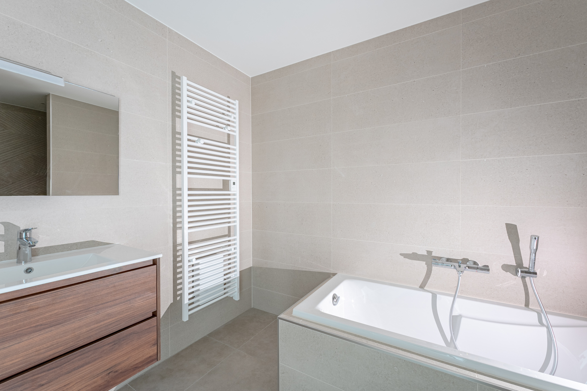 Une salle de bains moderne de 7,39 m² équipée d’une douche à l’italienne, d’une baignoire, d’un sèche-serviette soufflant et d’un carrelage intégral,