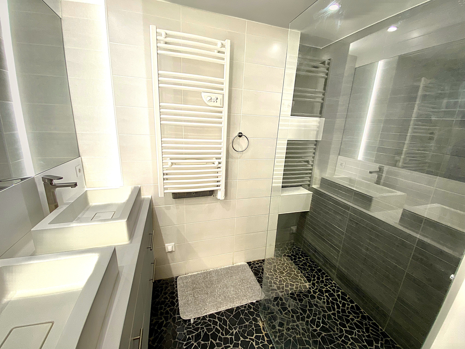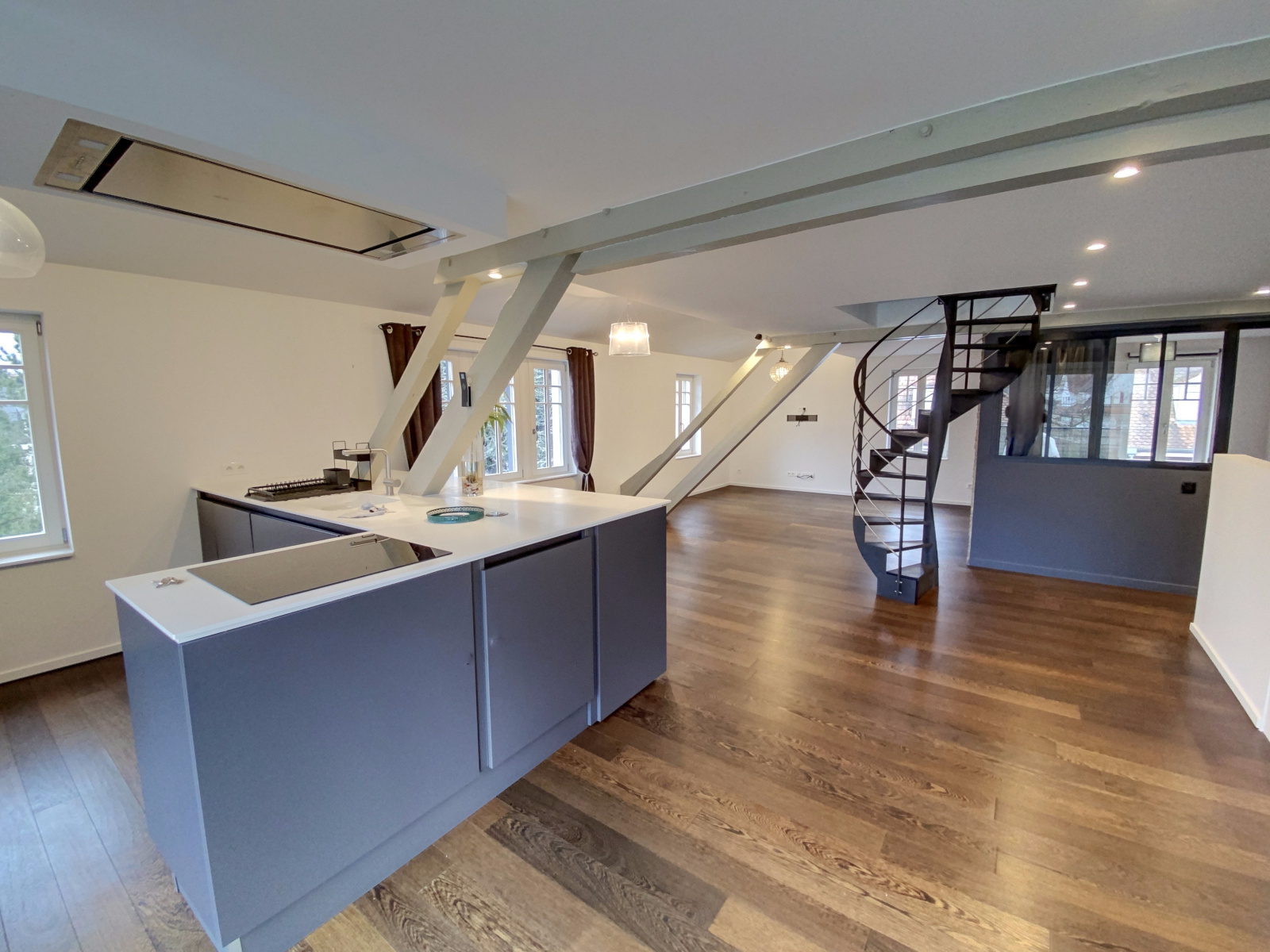 * une vaste pièce de vie de plus de 70 m² équipée de parquet massif, d’une cuisine entièrement équipée ainsi que d’une climatisation réversible pour un confort optimal été comme hiver et une seconde chambre avec sa salle de bain attenante,