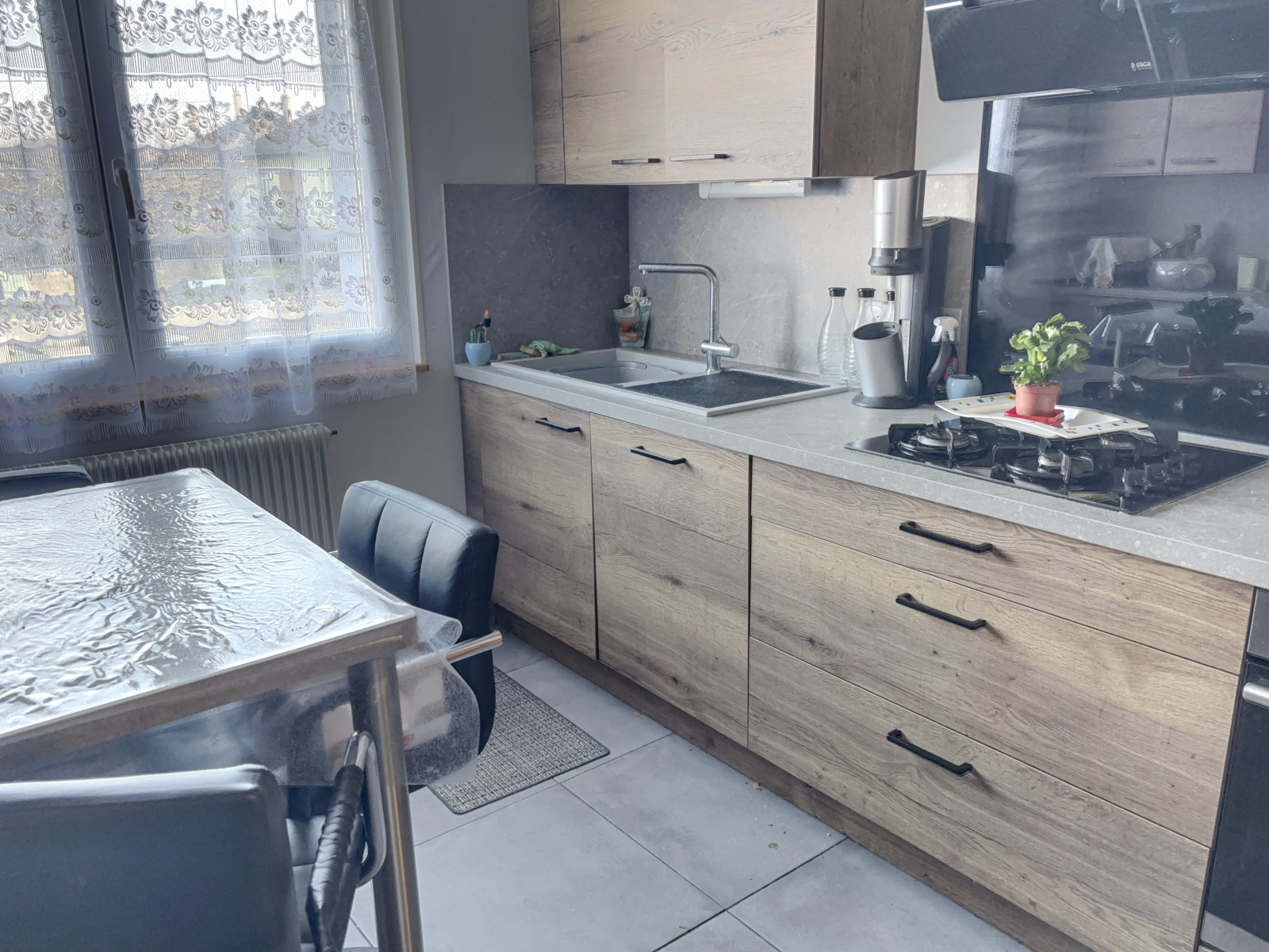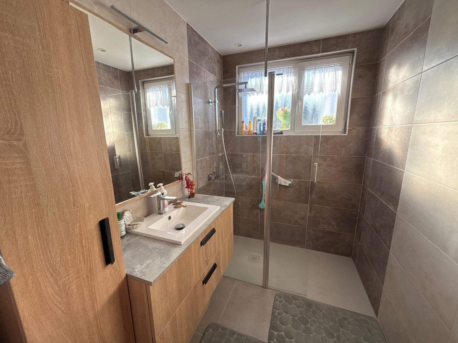 Contenance : Entrée avec placards de rangement, wc séparé, salle de bain, cuisine neuve entièrement meublée et équipée et 3 chambres. Au sous-sol: une douche, une chambre, une cuisine d'été et un garage motorisé pouvant accueillir 2 voitures.