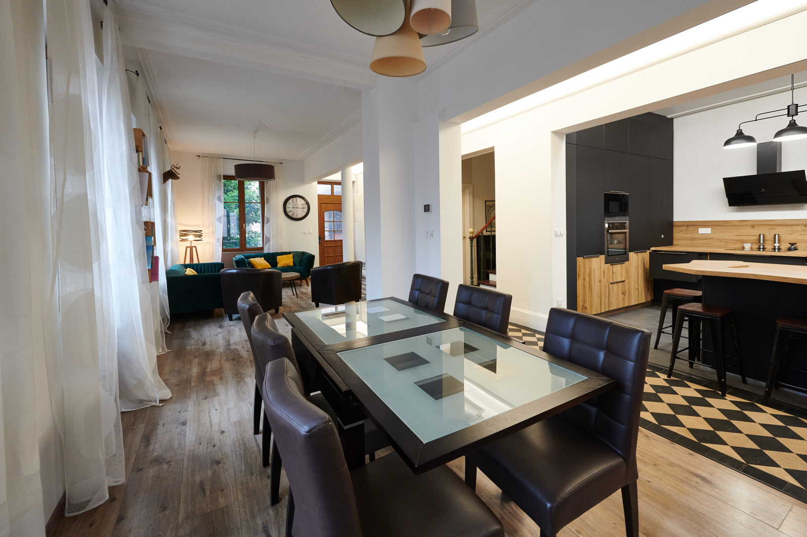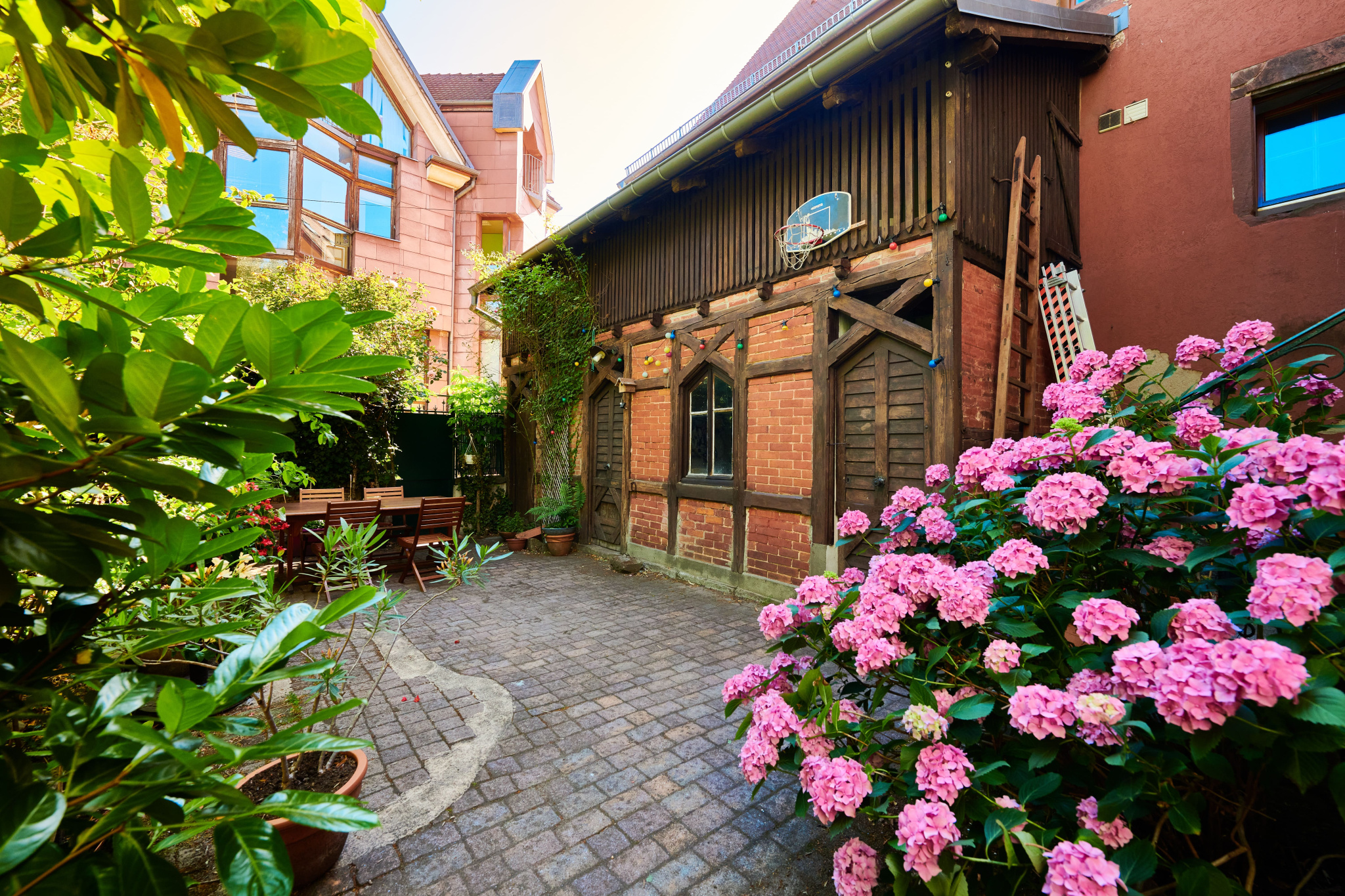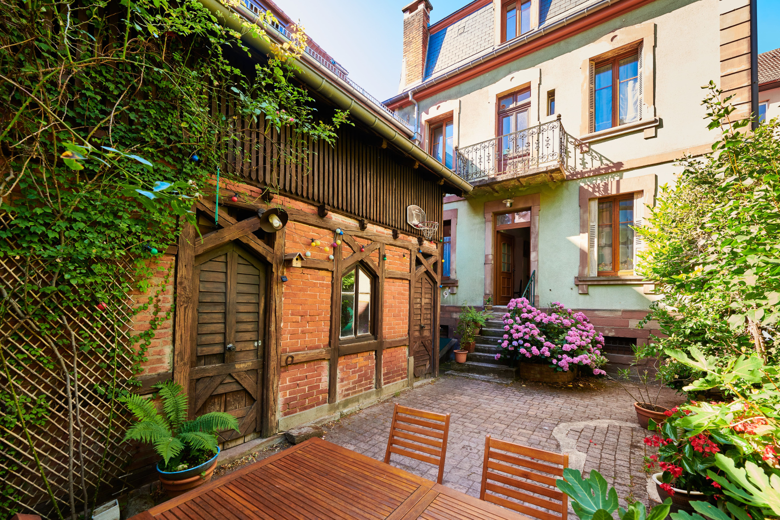 Derrière ses façades pleines de caractère, la maison s'organise autour de volumes généreux et lumineux. Une cave et une cour intérieure intimiste avec son appenti viennent compléter l'ensemble. Les extérieurs, entièrement clos et arborés, garantissent calme et intimité en plein centre ville.