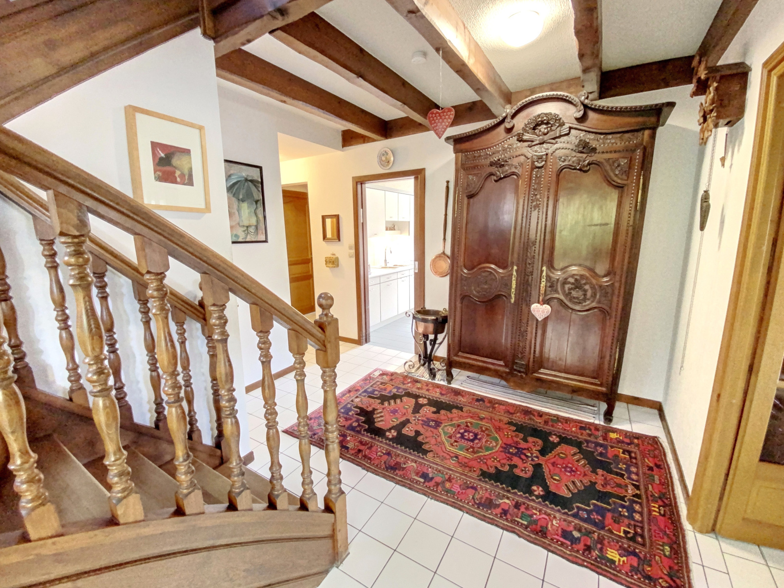 Au rez de chaussée, un vaste hall d'entrée, un salon et salle à manger d'environ 40 m², une chambre à coucher, un bureau et une salle d'eau. La cuisine séparée vous mène vers une grande terrasse sans aucun vis à vis.
